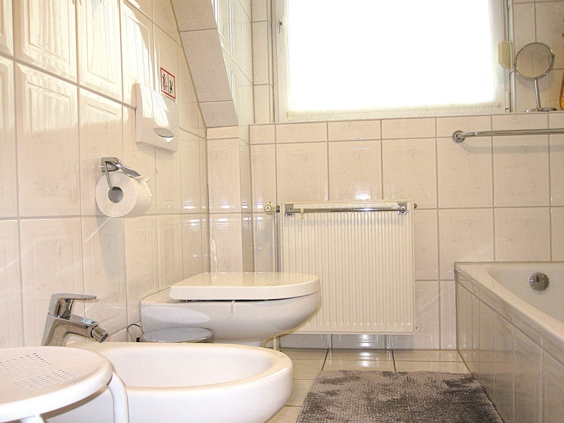 Das großzügig ausgestattete Bad bietet Duschkabine, Waschplatz mit Badmöblierung, Bidet und WC.