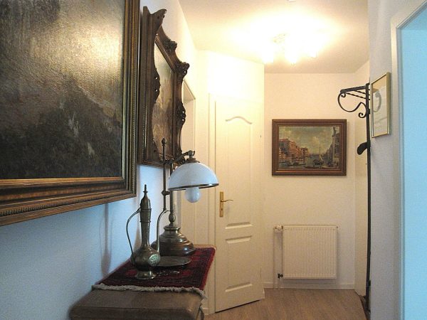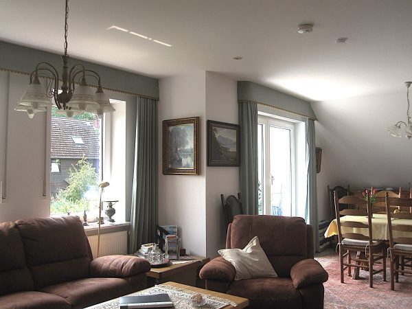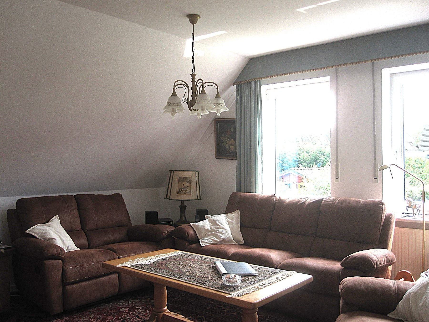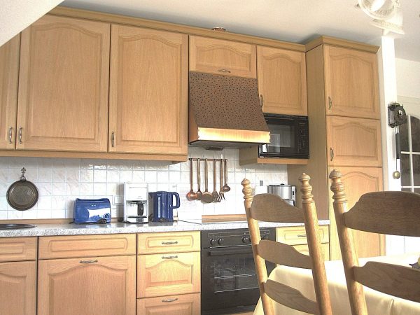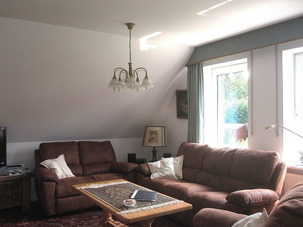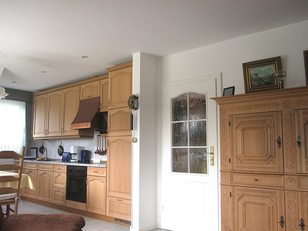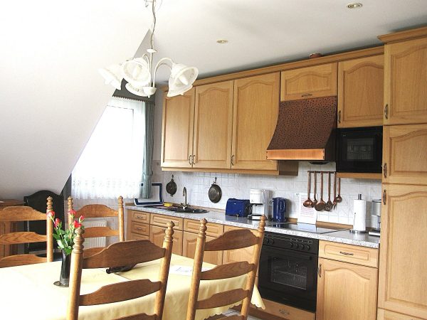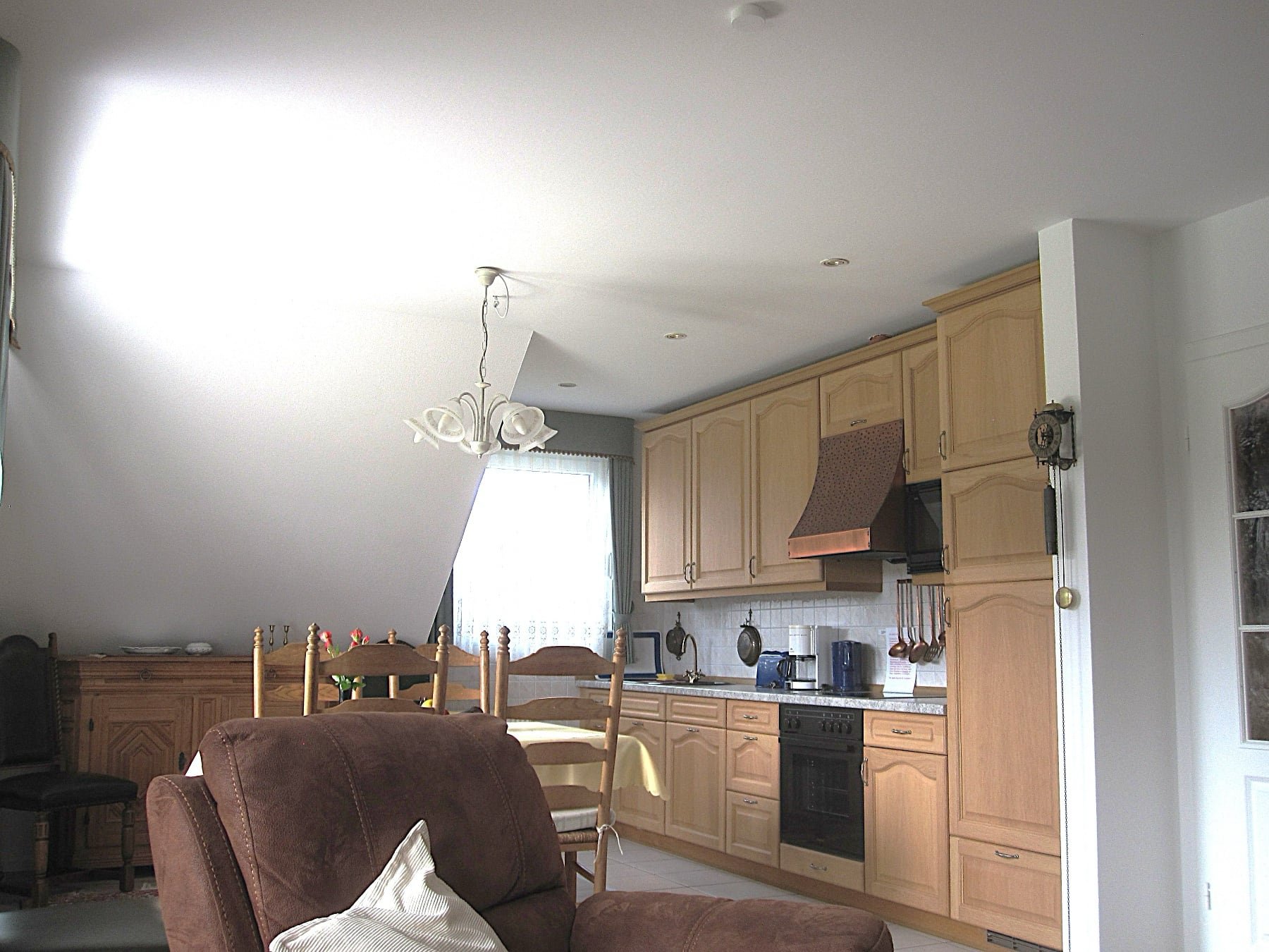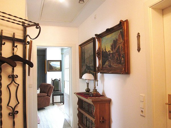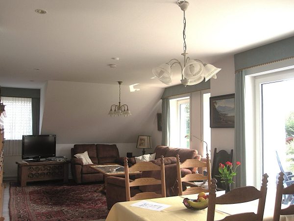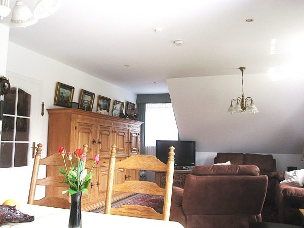 In dieser Ferienwohnung erwartet Sie eine Innenausstattung, die keine Wünsche offenlässt. Im geräumigen Wohn-/Essbereich finden Sie edles Mobiliar, darunter eine hochwertige Polstergarnitur, einen antiken Eichentisch, sowie einen handgearbeiteten Eichenschrank.